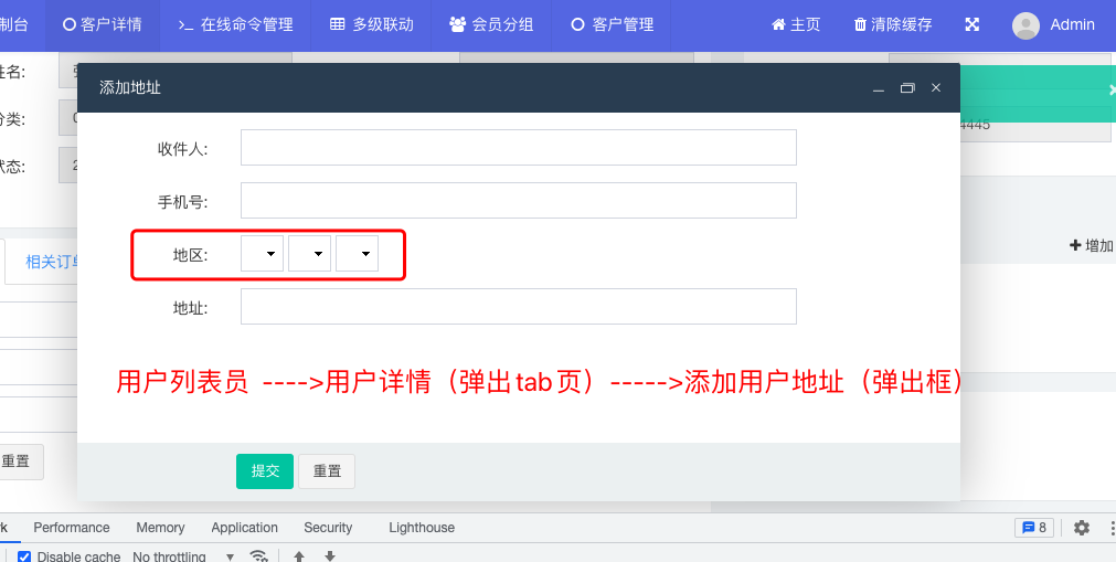 我的使用环境是在 用户列表查看用户详情,弹出用户详情TAB页,在用户详情点击“添加”弹出“添加地址”框,把示例中的地区三级联动复制进去,显示如上图空白,应该怎么使用?