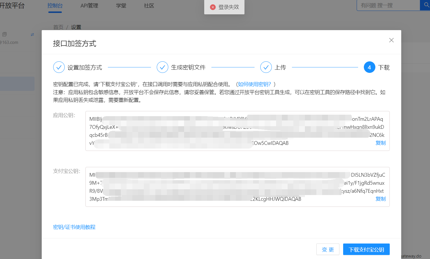 您好、刚开始我一直认为是我秘钥配置错了、然后在支付宝支付官网提交工单、再三确认秘钥没有问题、我自己秘钥填的也是对的、就是接入不了支付宝支付!提示页面无法访问!!!