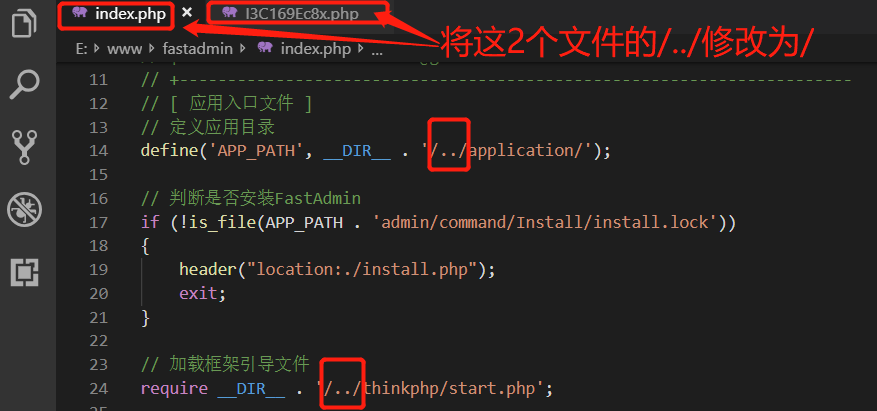 第二步、修改入口文件index.php和admin.php文件。将这两个文件代码中的/../修改为/