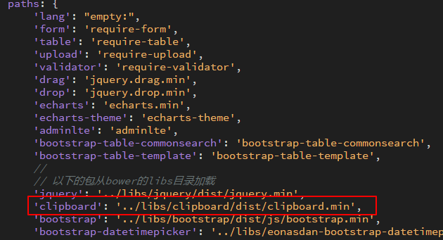paths: { // 以下的包从bower的libs目录加载 'clipboard': '../libs/clipboard/dist/clipboard.min',Paths追加效果图: