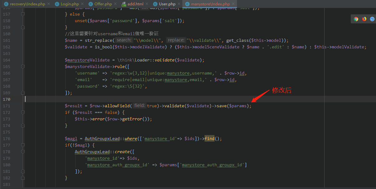 接着,修改manystore/index.php 里面的edit方法,判断插入的数据是否是数据库字段