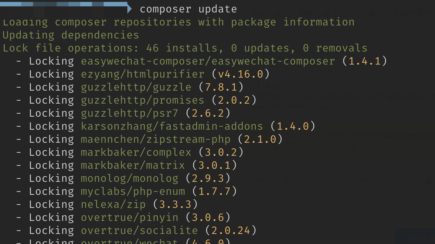 原因:FastAdmin 最新版支持了 PHP8.0 使用 nelexa/zip 到 ^4.0 ,因为k大当时php环境是 >= 7.4 的,所以安装的扩展是必须 >= 7.4 ,使用 composer update 更新下扩展即可。